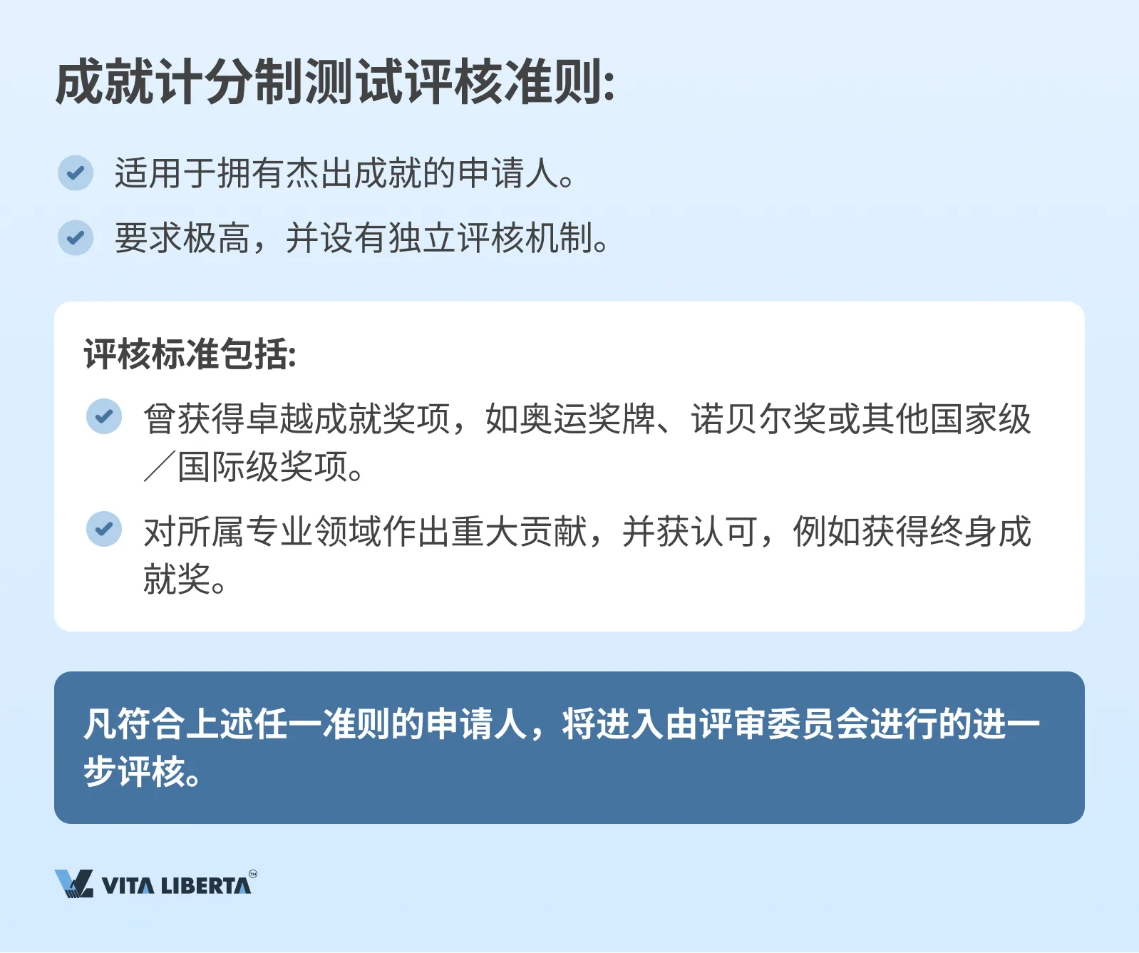 本计划亦适用于具备卓越才能及技能、并能证明其杰出成就的人士。成就计分制要求极高,符合以下任一准则的申请人将被甄选进入下一步由评审委员会进行的评估;未符合者,其申请将被拒绝。
