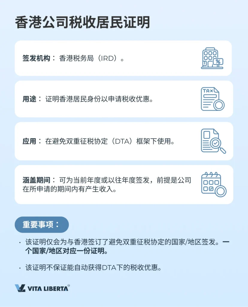 税收居民证明(Certificate of Residence, CoR)是用于确认香港居民身份的文件,旨在根据避免双重征税协定(DTA)申请税收优惠。该证明可作为居民身份的凭证,涵盖当前或过往年度,且仅针对与香港签订协定的国家/地区签发。