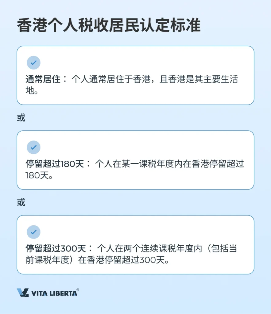 - 两年内停留超过300天: 个人在两个连续年度内(包括当前课税年度)在香港停留超过300天。