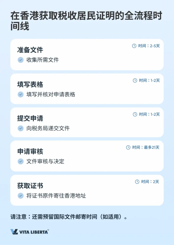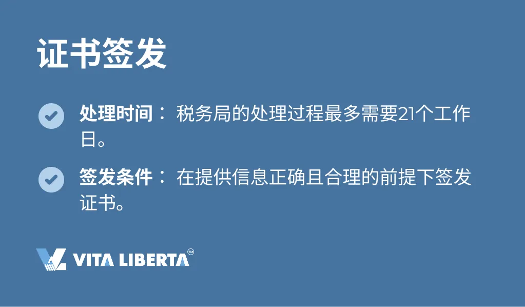 申请提交后,香港税务局会审核申请,并在必要时要求提供补充信息。如果提供的信息正确且合理,税务局将签发证书。通常,申请处理过程最多需要21个工作日。