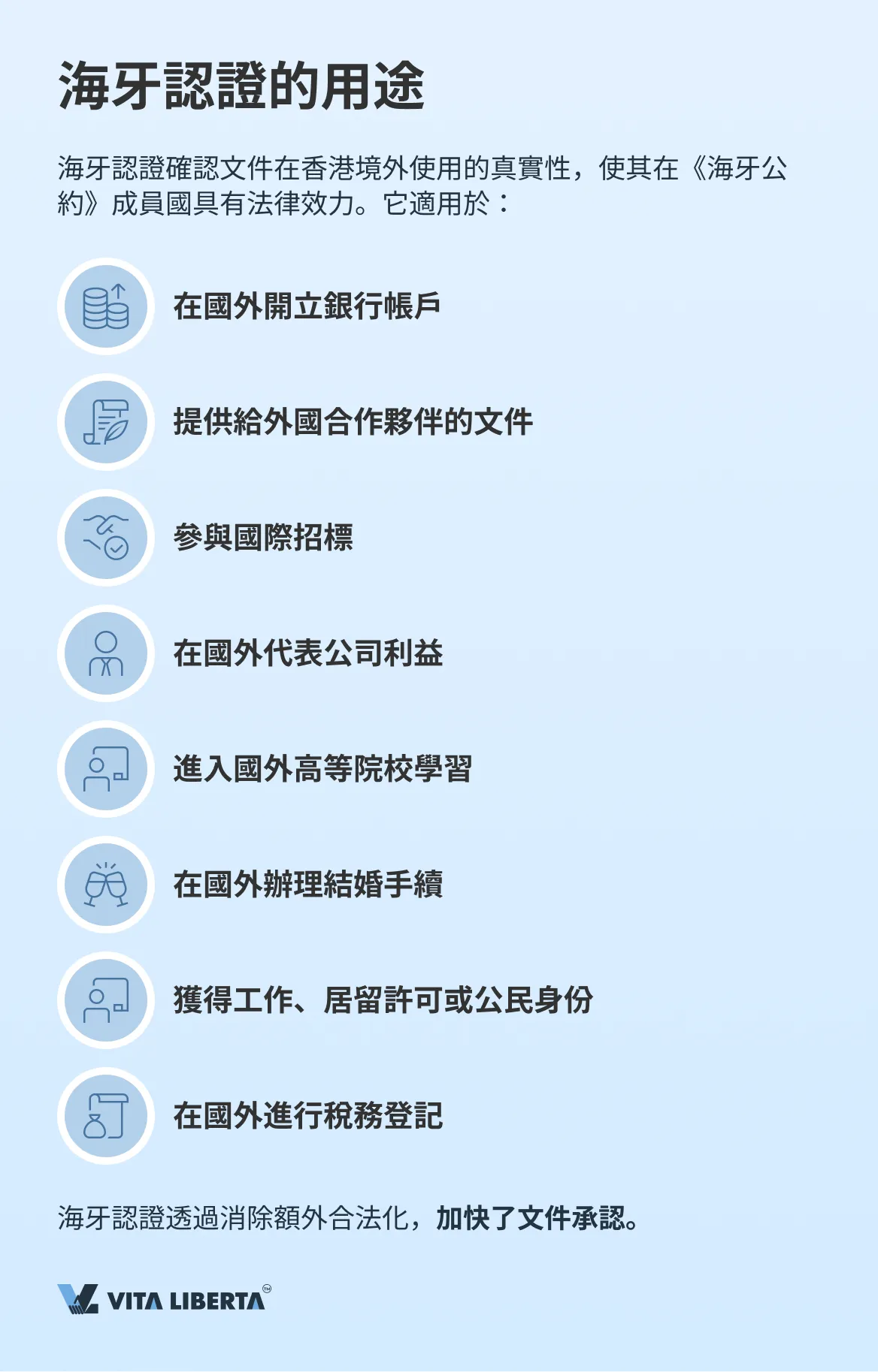海牙認證透過消除額外合法化的需要,顯著加快了文件承認的流程,並便於文件在《海牙公約》成員國使用。