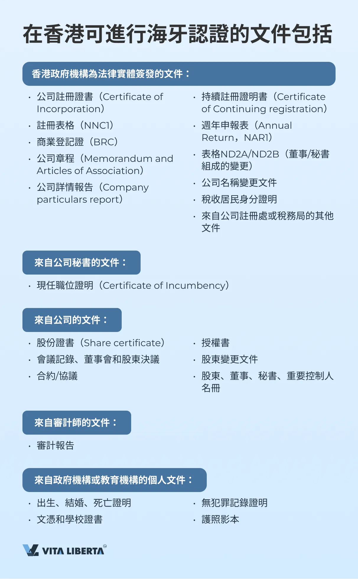 在香港,各種公司文件均可進行海牙認證,包括: