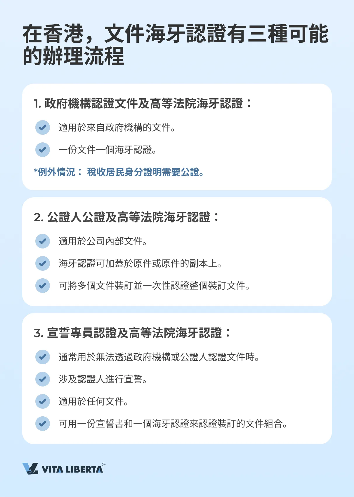 - 由宣誓專員認證文件/文件組合並在香港高等法院加蓋海牙認證。