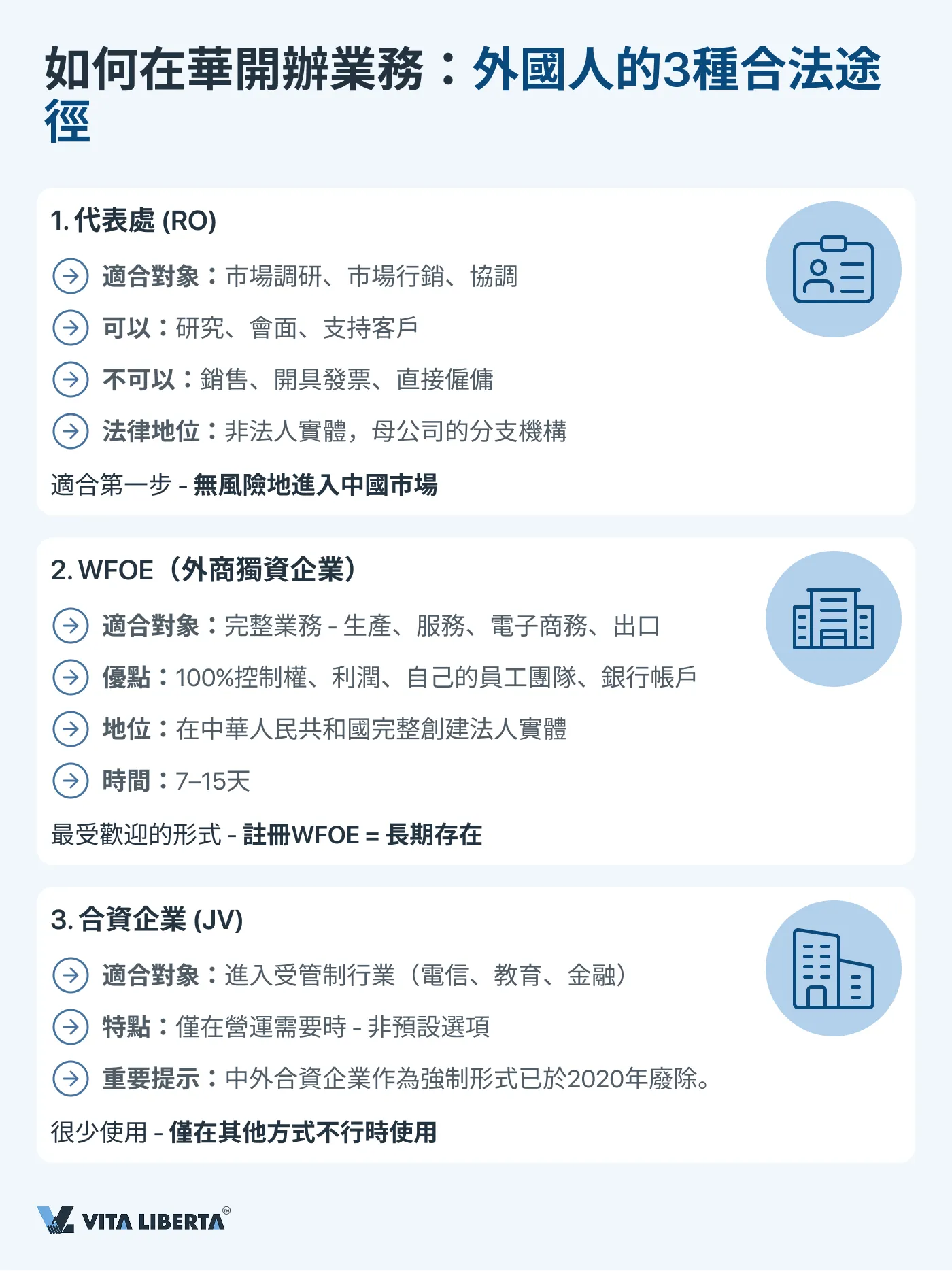 選擇取決於目標:在中國市場進行現場銷售幾乎總是需要WFOE,而市場調研和B2B支援則可以通過代表處完成。