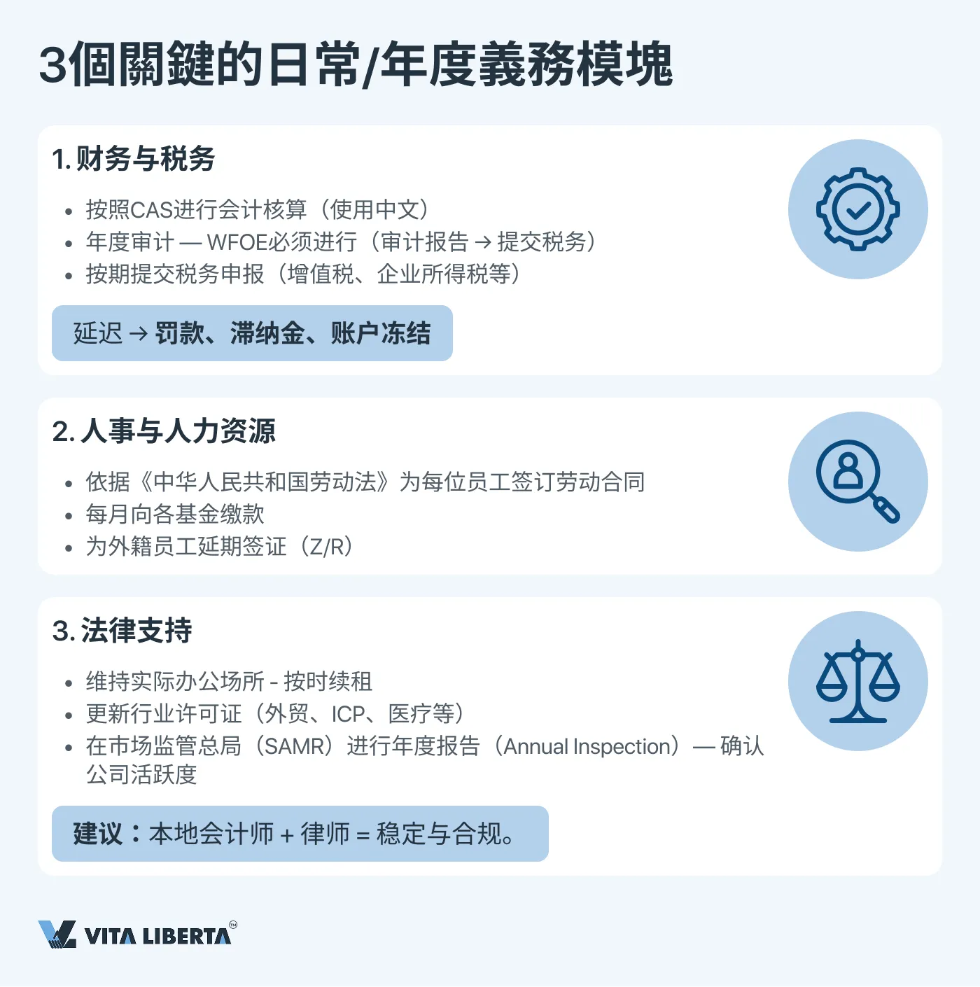- 財務與稅務:按照中國標準(CAS)進行會計核算,提交定期稅務報告,以及WFOE的強制性年度審計。