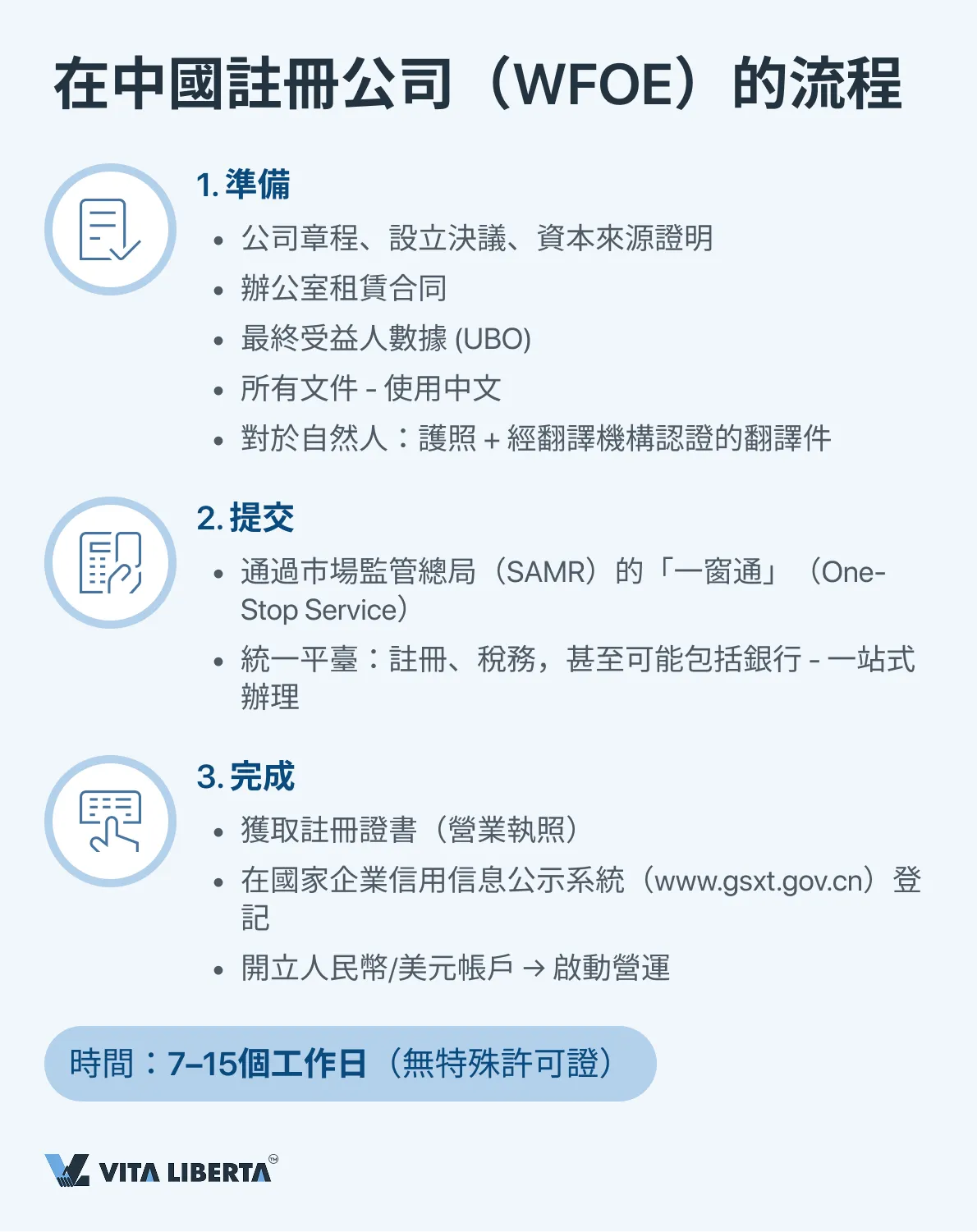 - 文件提交 – 通過市場監管總局(SAMR)的「一窗通」(One-Stop Service):公司章程、設立決議、資金來源證明、最終受益人數據。