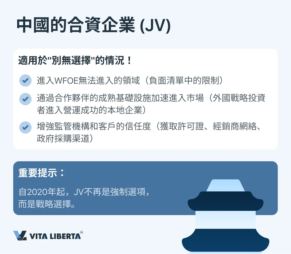 儘管隨著《外商投資法》(2020年)的通過,在大多數行業中強制設立JV的要求已被取消,但在商務部(MOFCOM)和國家發改委(NDRC)批准的《外商投資准入特別管理措施(負面清單)》(2025年版)所包含的領域中,它仍然是關鍵工具。