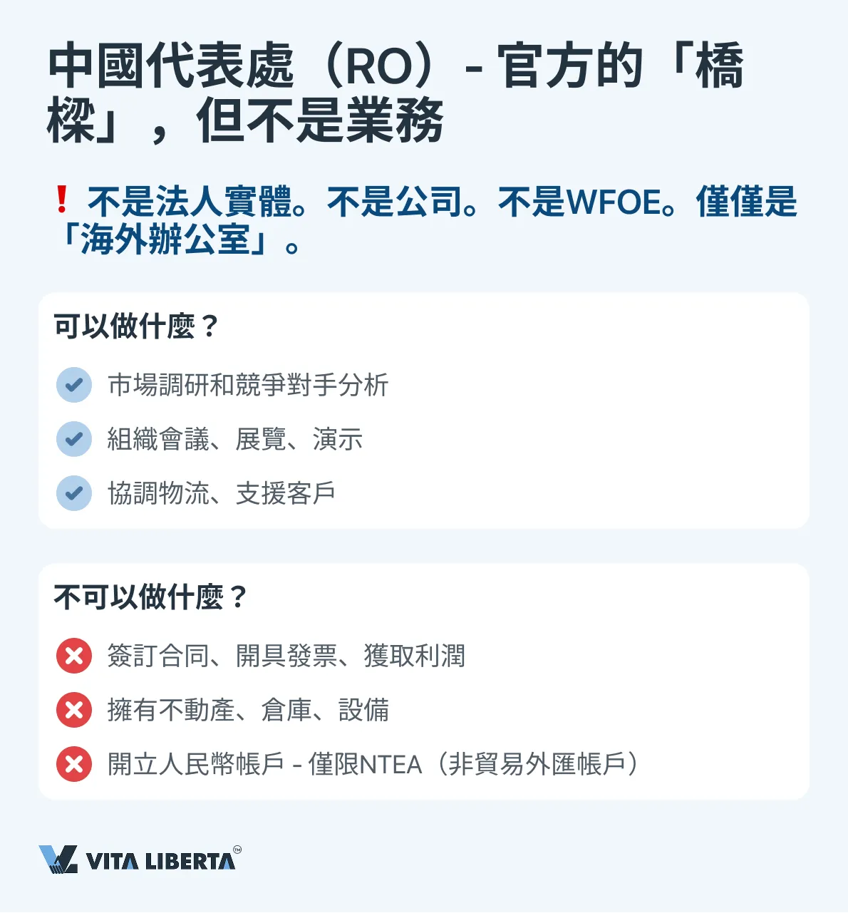 代表處(Representative Office, RO)不是法人實體,而是外國公司的地域性分支機構,經正式認證可在中華人民共和國境內從事非商業活動。它代表總部行事,不具備獨立的法律人格。