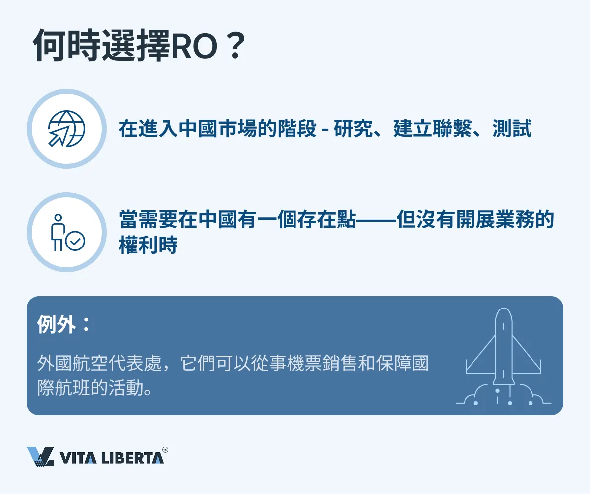 這種形式在進入中國市場的階段需求較大,此時需要進行需求研究、建立聯繫和制定戰略——而無需承擔稅務、註冊資本或複雜設立的義務。