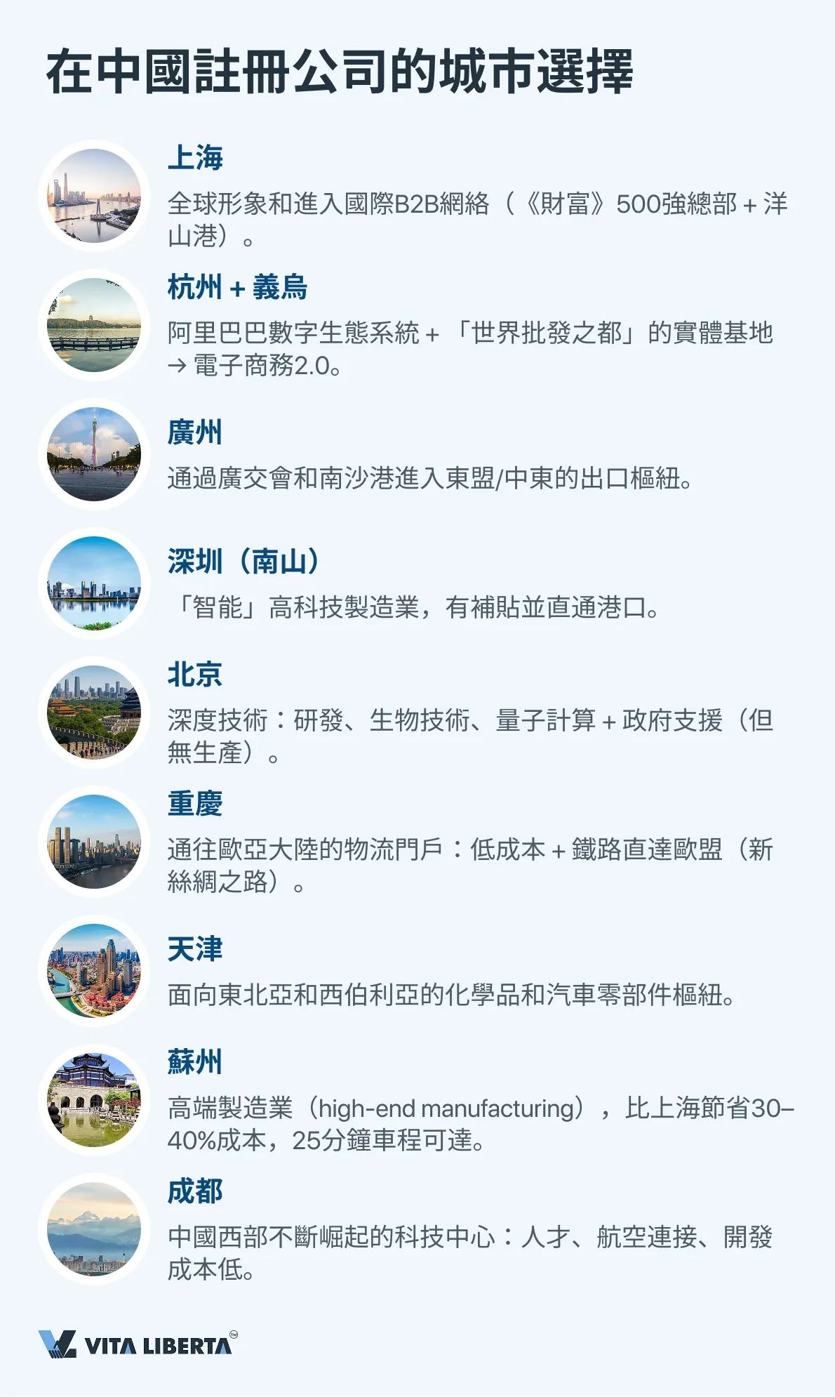 - 杭州:得益於阿里巴巴生態系統及靠近「世界批發之都」義烏,是數字項目(SaaS、人工智能、電子商務)和批發貿易的理想之地。