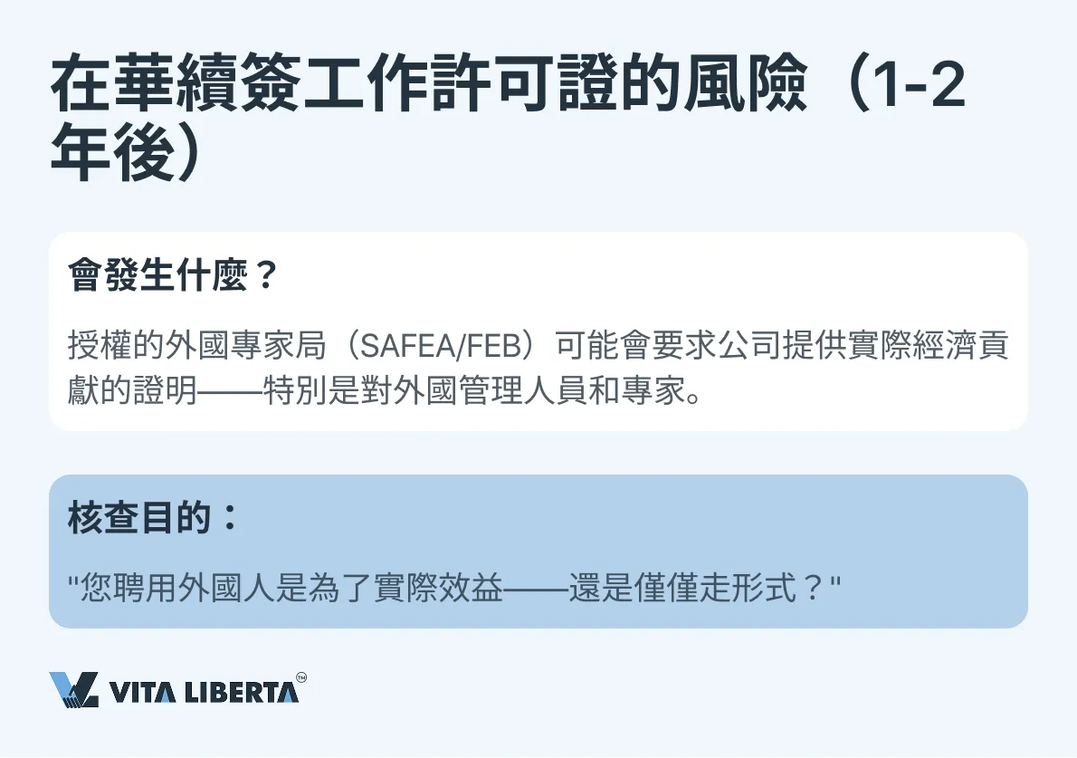 在初次辦理約1-2年後,在續簽《外國人工作許可證》過程中,授權的外國專家事務局(FEB/SAFEA)可能啟動對用人單位實際經濟活動及外國管理人員繼續留任合理性的深入核查。核查目的是確認聘用外國人員為當地經濟帶來了切實效益。