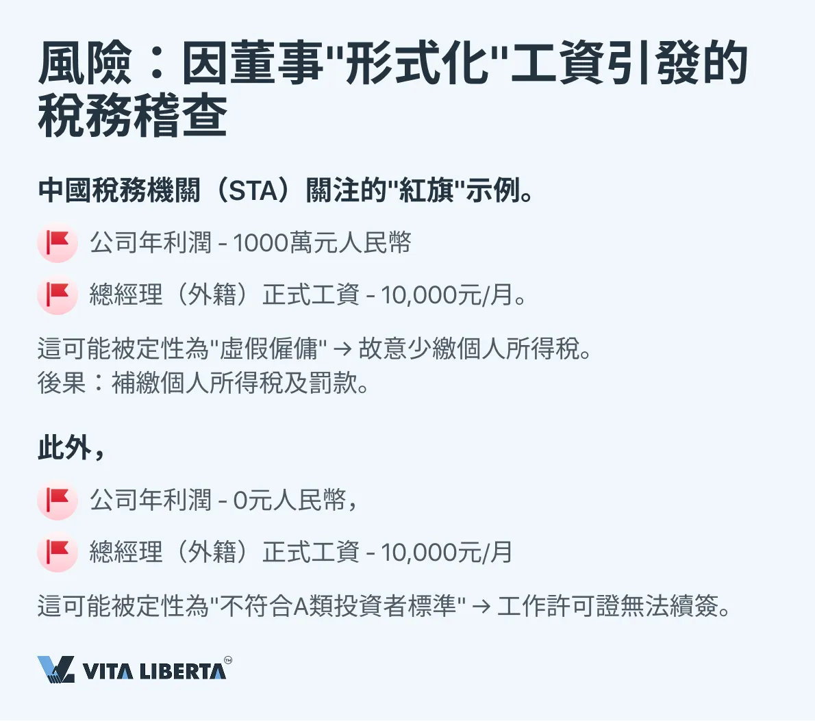 答: 是的,這是主要風險之一。如果關鍵外國管理者的正式工資(例如10,000元人民幣)與公司利潤(例如數百萬元)嚴重不匹配,稅務機關(STA)可能將其視為以逃避個人所得稅為目的的虛假僱傭。後果包括補繳稅款、大額罰款以及工作許可證續簽問題。