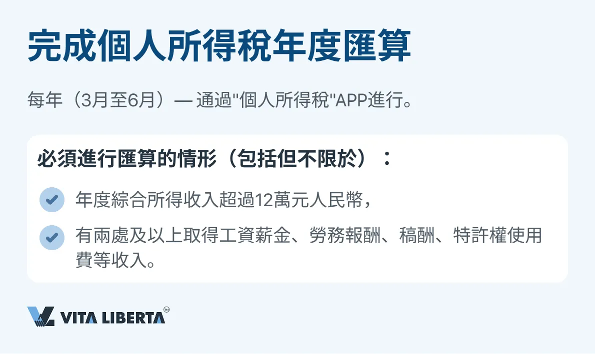- 完成年度個人所得稅綜合所得匯算清繳 (Annual Tax Settlement)