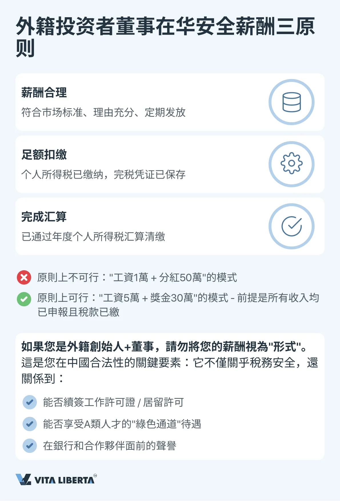 對於外籍投資者兼董事而言,將自己的正式工資視為技術性支出項目是不可接受的。其數額必須經濟合理,所有相關的納稅義務都必須系統、透明地履行。這種方法不僅消除了補稅和罰款的風險,而且在中國監管機構眼中為公司樹立了無可挑剔的商業信譽。