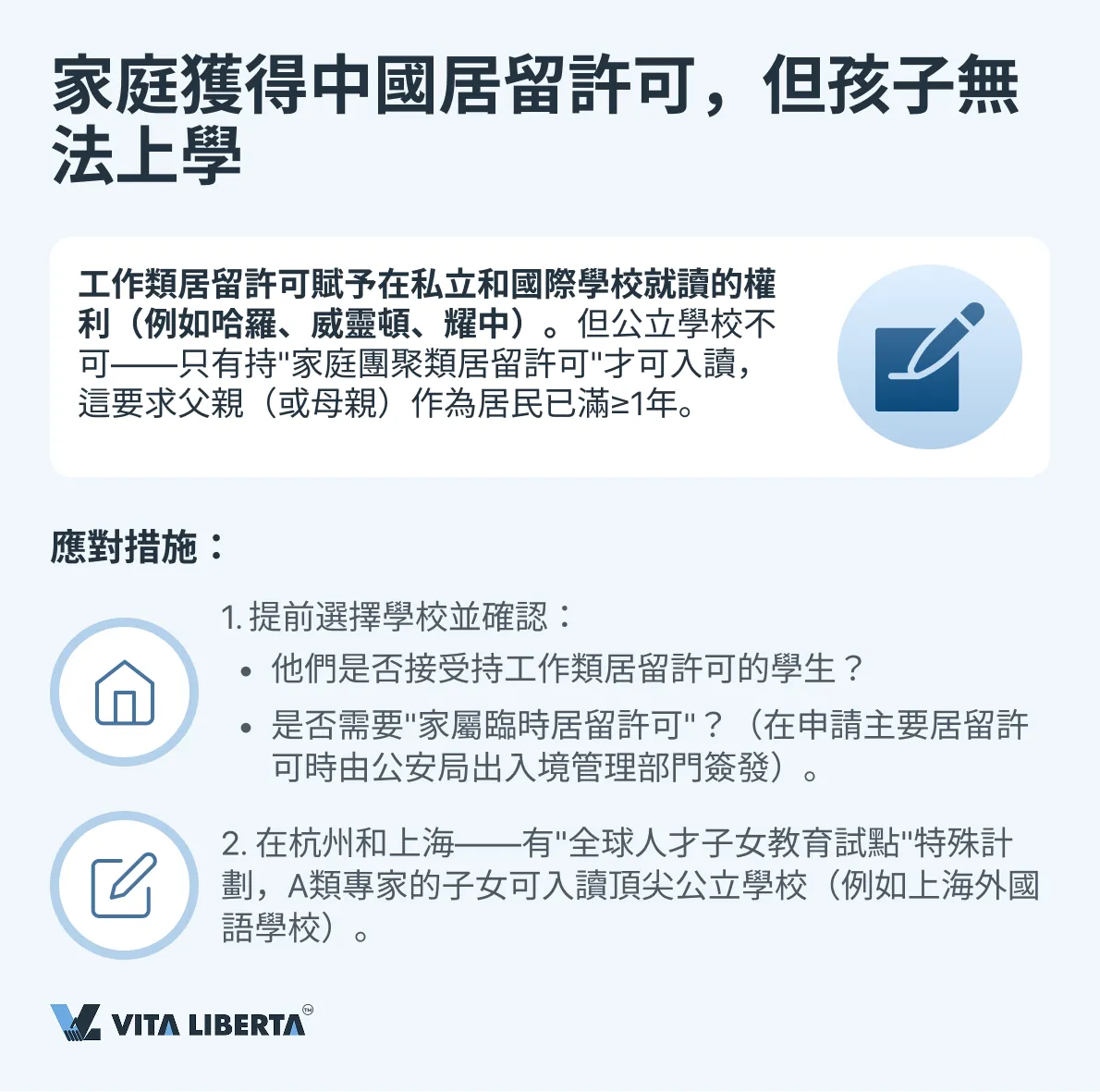 解決方案: 1)提前與選定學校溝通並申請”家屬臨時居留許可”。2)了解針對高層次人才(A類)的區域性項目,例如上海/杭州的”全球人才子女教育試點計劃”。3)長遠來看,轉為家庭團聚類居留許可,這將獲得完全准入資格。