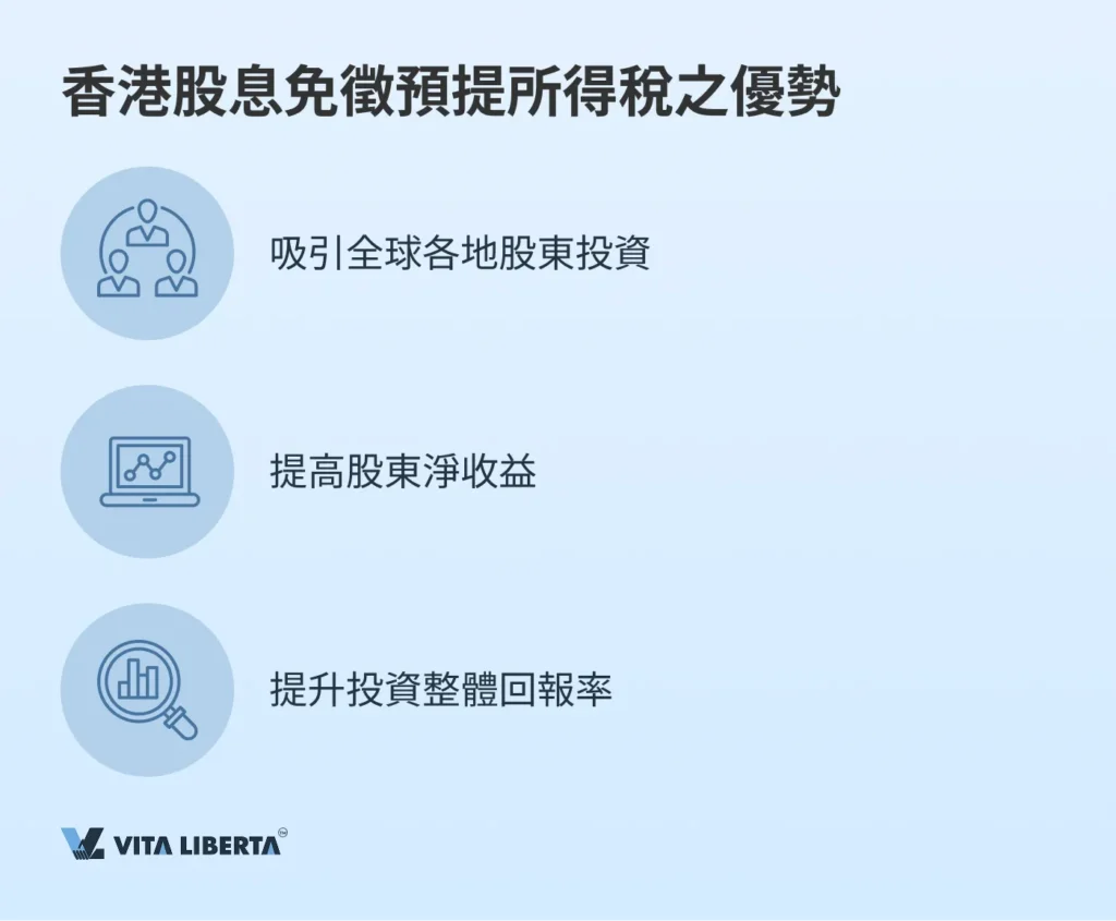 股息免徵預提所得稅,提升了股東之淨收益,使投資香港公司更具吸引力;對企業而言,則意味著更能吸引投資者關注,並可更靈活地管理財務資源。
