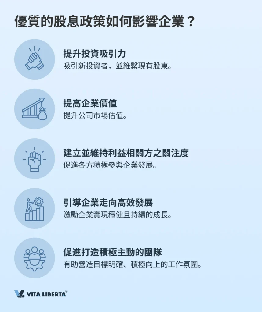透過定期派息以提升公司聲譽,有助吸引新投資者並留住現有股東,進而推動公司股價上漲,並全面提升企業於市場中的整體穩定性。