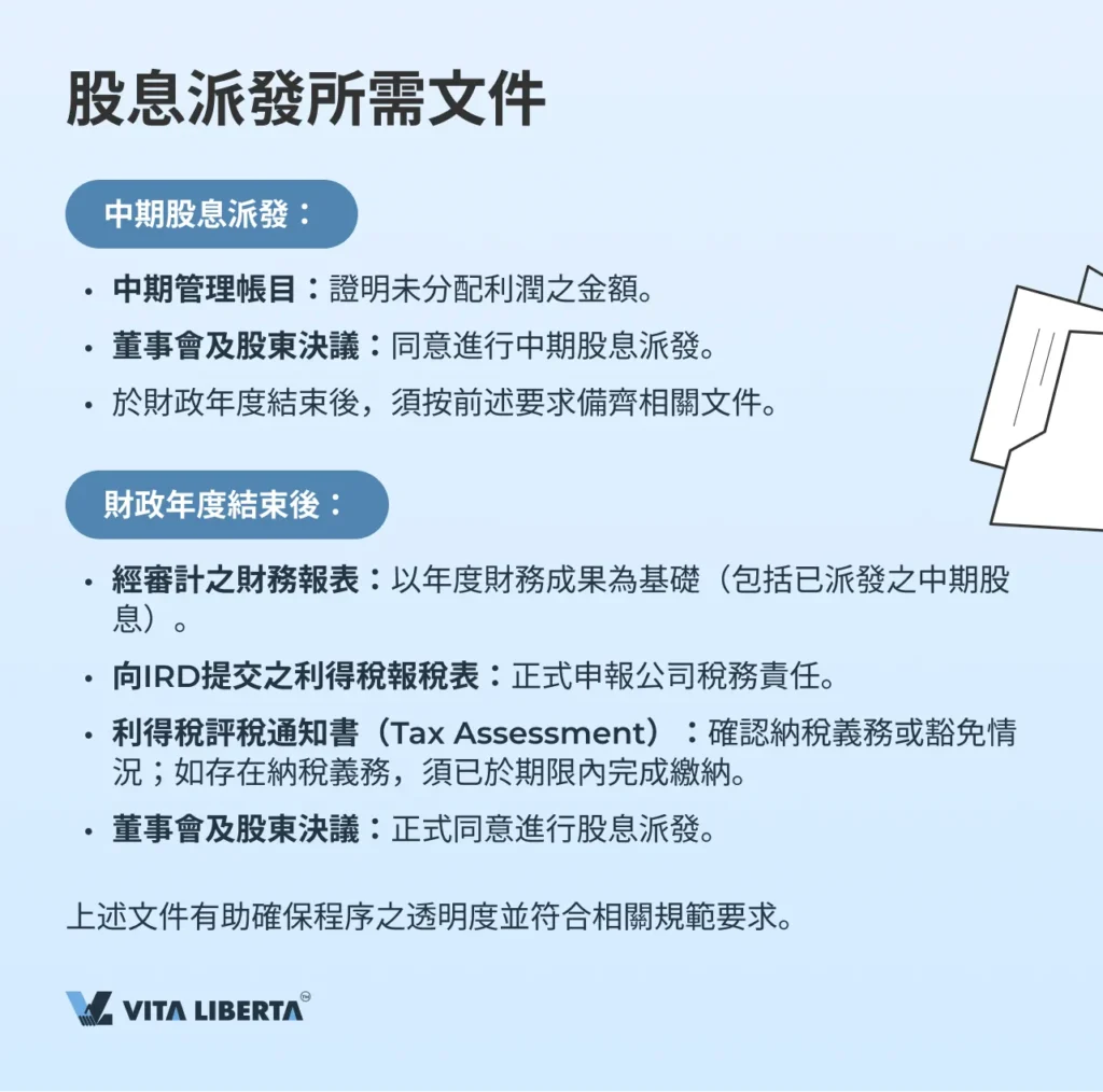 中期股息派發須提交中期管理帳目及董事會決議;財政年度結束後,則須提供經審計之財務報表、利得稅報稅表、已履行納稅義務之證明(或官方豁免文件),以及董事會決議。