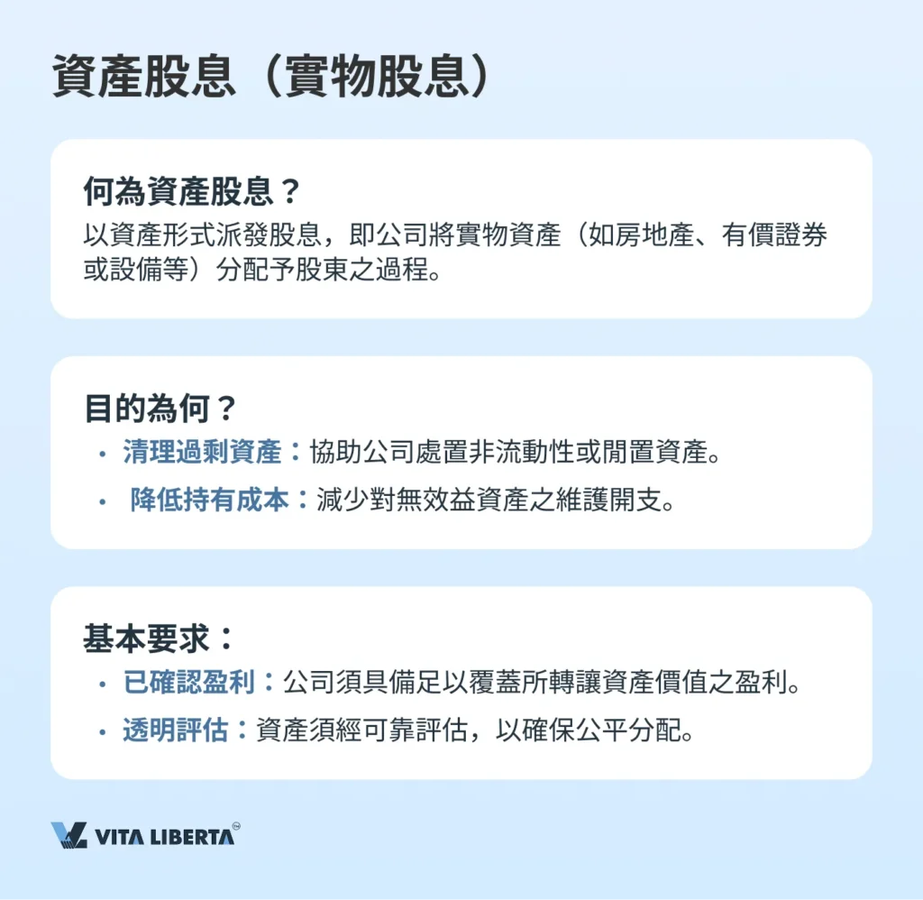 此種股息形式讓公司得以處理過剩或閒置資產,尤其當該等資產對公司當前營運缺乏流動性、未能產生預期效益,或維持成本過高時尤為適用。