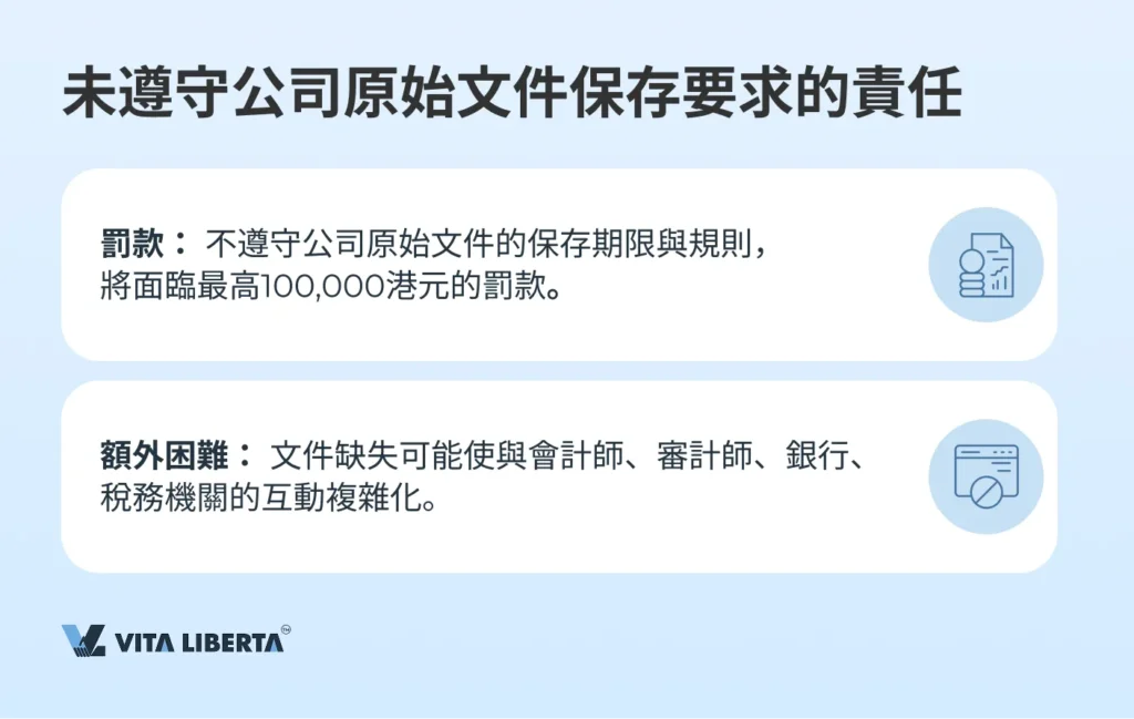 如果公司未能在稅務機關提出要求後的7天內提供所需文件,將面臨最高可達100,000港元的罰款。此外,不遵守文件保存規定可能導致額外的核查和審計。因此,確保所有文件都井然有序並隨時可用非常重要。