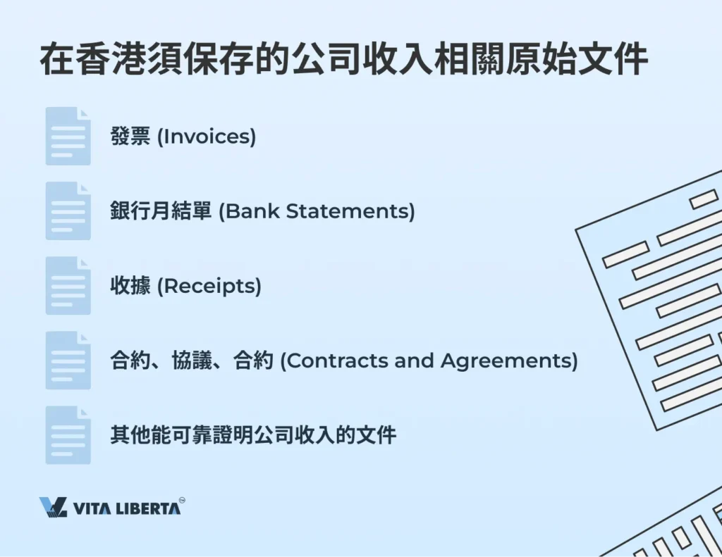 在香港,公司有義務保存證明營業額與收入的原始文件,以確保準確核算並遵守《稅務條例》。以下是必須保存的主要文件類型: