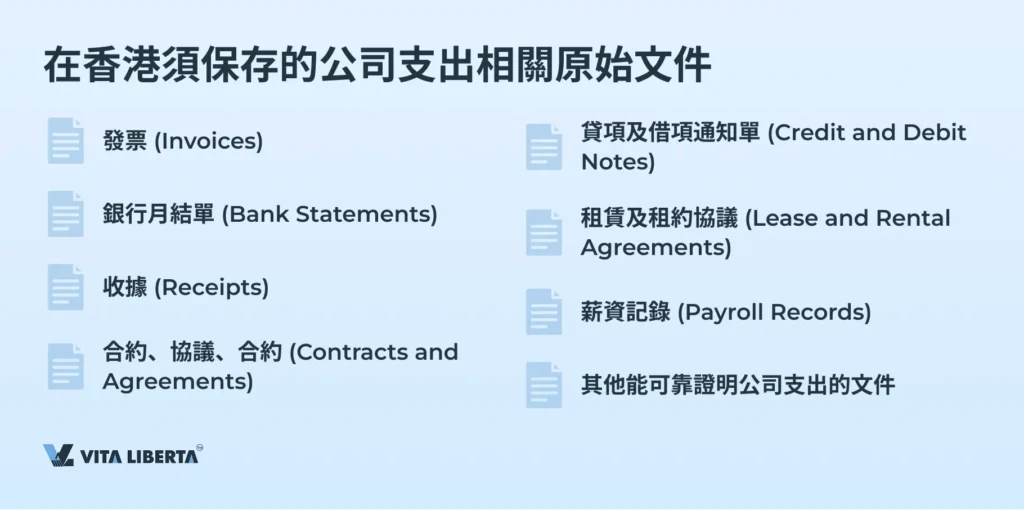 在香港,公司有義務保存證明支出的原始文件,以確保準確核算並符合稅務要求。以下列舉了必須保存的主要文件類型: