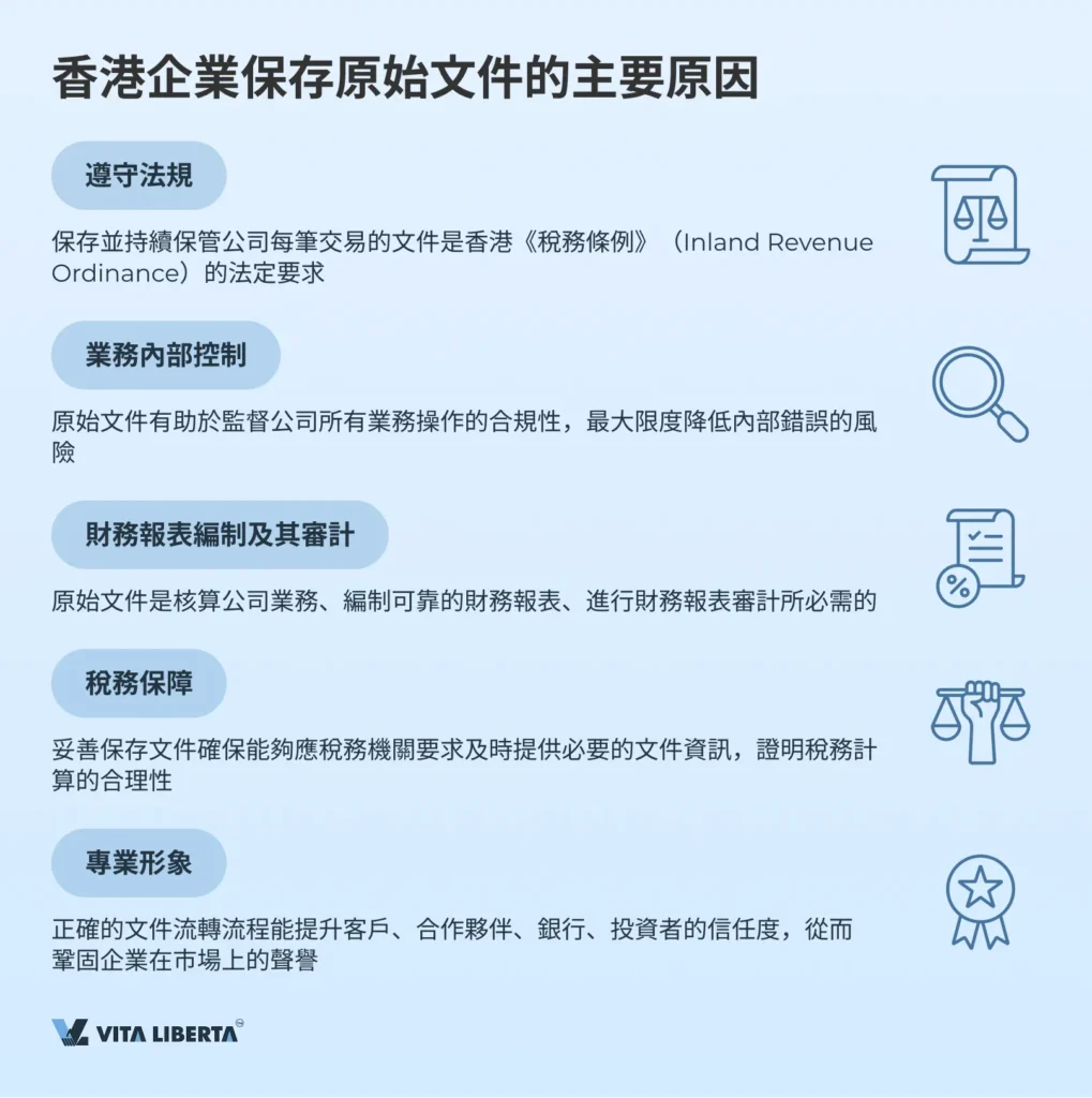 保存原始文件有助於公司在香港特別行政區內合法運營,並建立健康的業務管理方法及其「歷史」的構建。這段「歷史」可能需要提供給稅務機關、銀行、投資者、審計師以及用於內部控制。